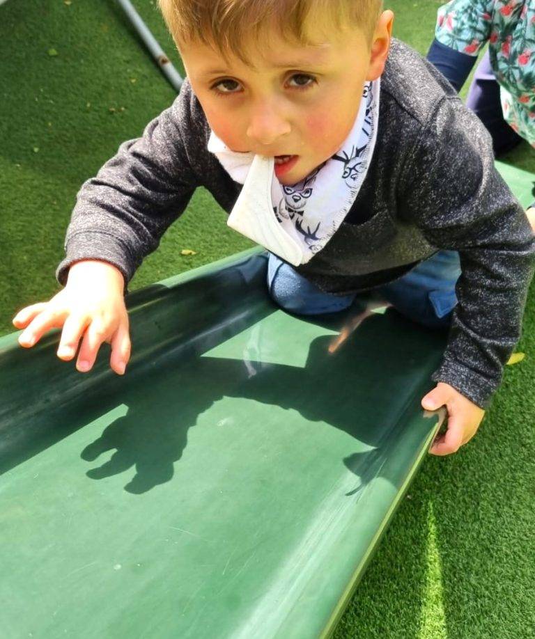 Simeon joined our reception class in January 2021. He presented as younger than his three and a half years. He couldn’t walk and preferred to lie on his back and study the clouds above. Though he showed intermittent interest in the surrounding environment, he did not have the motor planning or muscle tone to let him explore. He was reluctant and unable to carry his own body weight.